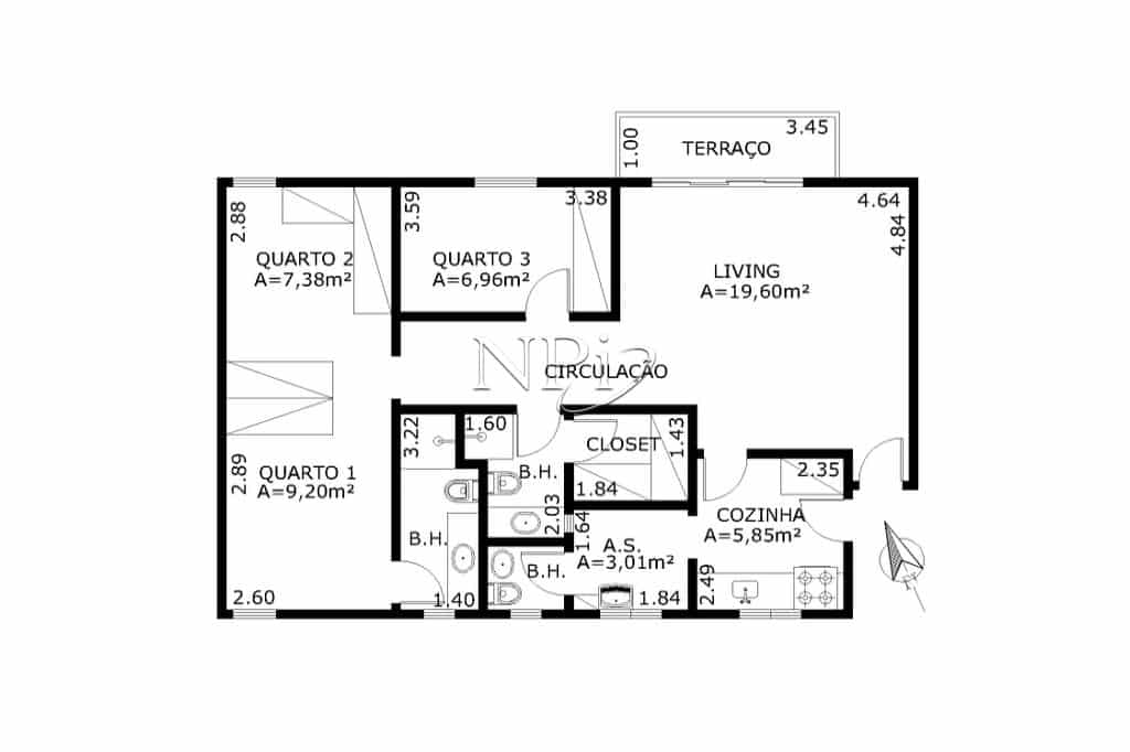 Íntimo: Circulação | Banheiro social | Escritório | Dormitório | Suíte com Closet | Banheiros com iluminação e ventilação natural.