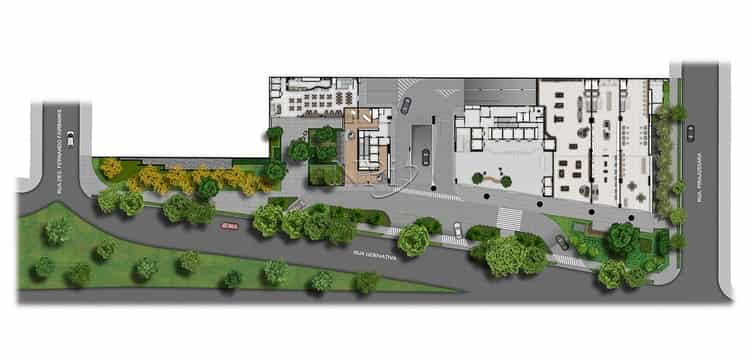 Em termos de acabamentos, o projeto atinge o nível máximo. Destaque para o lobby marcado por painéis ripados em madeira, piso em mármore e concreto aparente. Um lounge com mobiliário que respira design. Para finalizar, duas árvores preservadas preenchem o ambiente com muito verde. Um empreendimento à altura das suas expectativas.