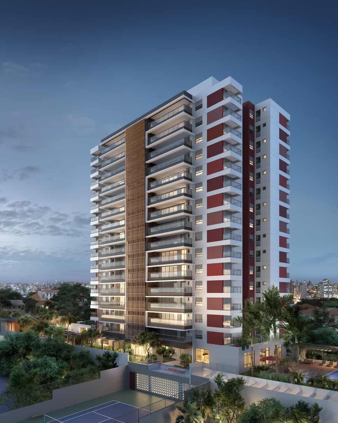 Praça de entrada, Churrasqueira, Salão de festas, Espaço Gourmet, Lounge externo com lareira, Brinquedoteca, Playground, Lobby, Espaço Fitness, Piscina com solarium, Deck molhado, Arquibancada, Quadra de Tênis, Espaço amenities, Bicicletário, Bike sharing, Oficina e Pet Place.