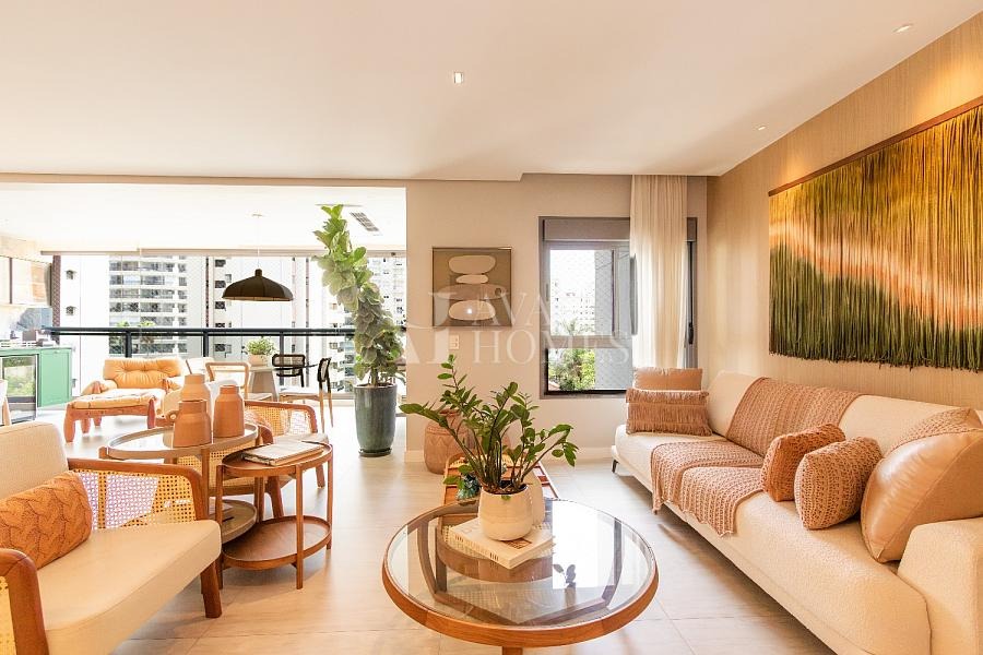 O apartamento conta com 3 suítes totalmente decoradas, equipadas com armários de alta qualidade e acabamentos elegantes, garantindo conforto absoluto e praticidade. Ao todo, são 4 banheiros, pensados para atender com funcionalidade e requinte.