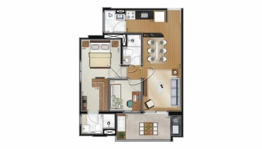 Os apartamentos deste condomínio têm 56m², podendo conter até 1 quarto (1 suíte), 2 banheiros, 2 vagas de garagem e elevador.