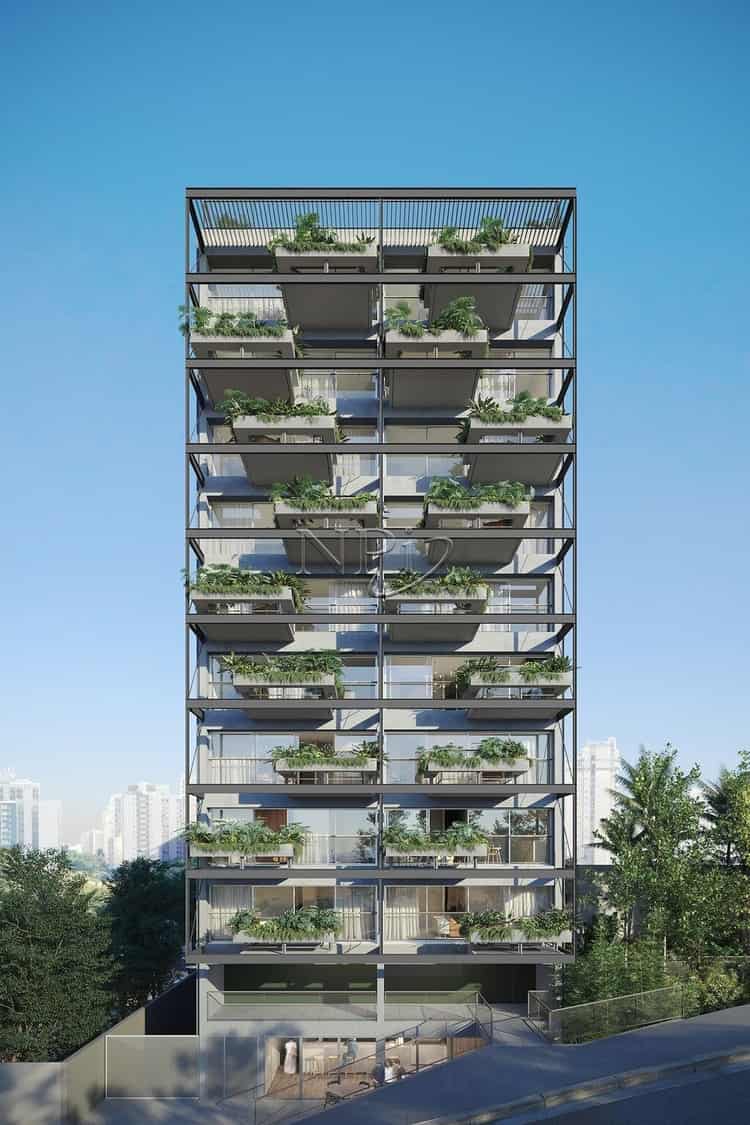 A fachada é composta por uma esguia estrutura metálica aparente que sustenta varandas intercaladas com momentos de pé direito duplo. Isso permite visuais ampliadas de céu para cada andar. Janelões em todos os cômodos proporcionam entrada abundante de luz natural, sem deixar de lado a privacidade que é garantida pelas jardineiras com irrigação automática. O resultado é uma fachada marcante mas ao mesmo tempo suave, permeada de verde e respeitando o gabarito do bairro.