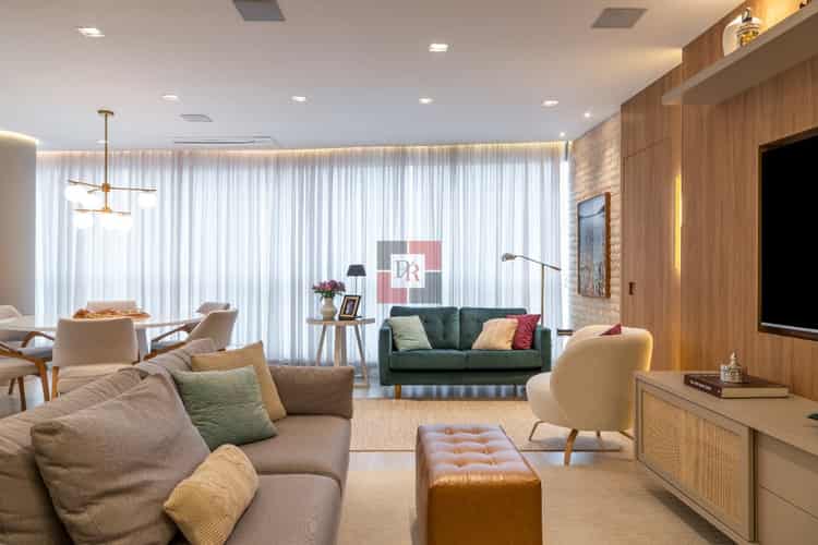 O living é um espaço amplo e luminoso, ideal para receber convidados ou relaxar com a família. As grandes janelas oferecem vistas panorâmicas da cidade, enquanto o mobiliário cuidadosamente selecionado complementa a estética moderna do apartamento.
