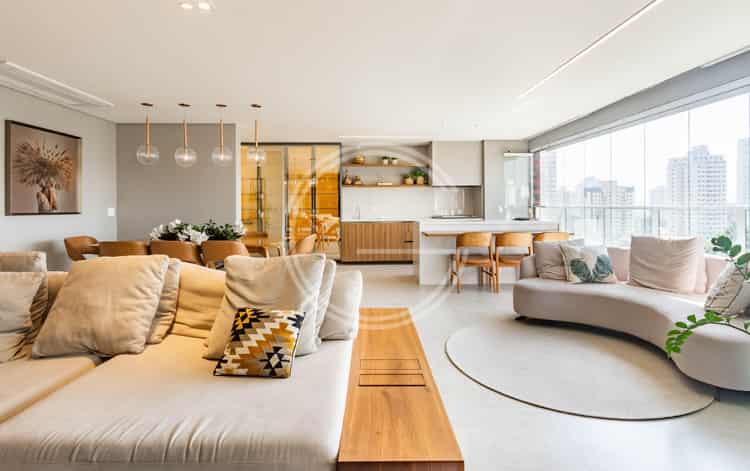 O apartamento conta com uma área de estar e jantar integradas, que se abre para uma varanda espaçosa, ideal para entretenimento e desfrutar de momentos ao ar livre. A cozinha é moderna e funcional, com equipamentos de última geração e bastante espaço de armazenamento. Na sala de estar você encontra uma adega de vinhos com acabamento em madeira e vidro, no corredor atras da sala uma cristaleira incrível, dando mais modernidade ao apartamento.