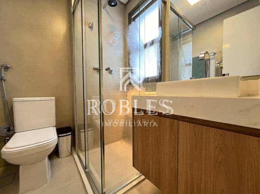 Os banheiros do apartamento são refinados, com grandes bancadas em mármore, que adicionam uma sensação de luxo e praticidade. O acabamento de alta qualidade é complementado por box de vidro, oferecendo um ambiente moderno e funcional. As bancadas espaçosas proporcionam conforto e espaço para itens de uso diário, e o design do banheiro é cuidadosamente projetado para unir estética e praticidade. A escolha de materiais de alta durabilidade e acabamentos impecáveis faz dos banheiros ambientes agradáveis e funcionais.