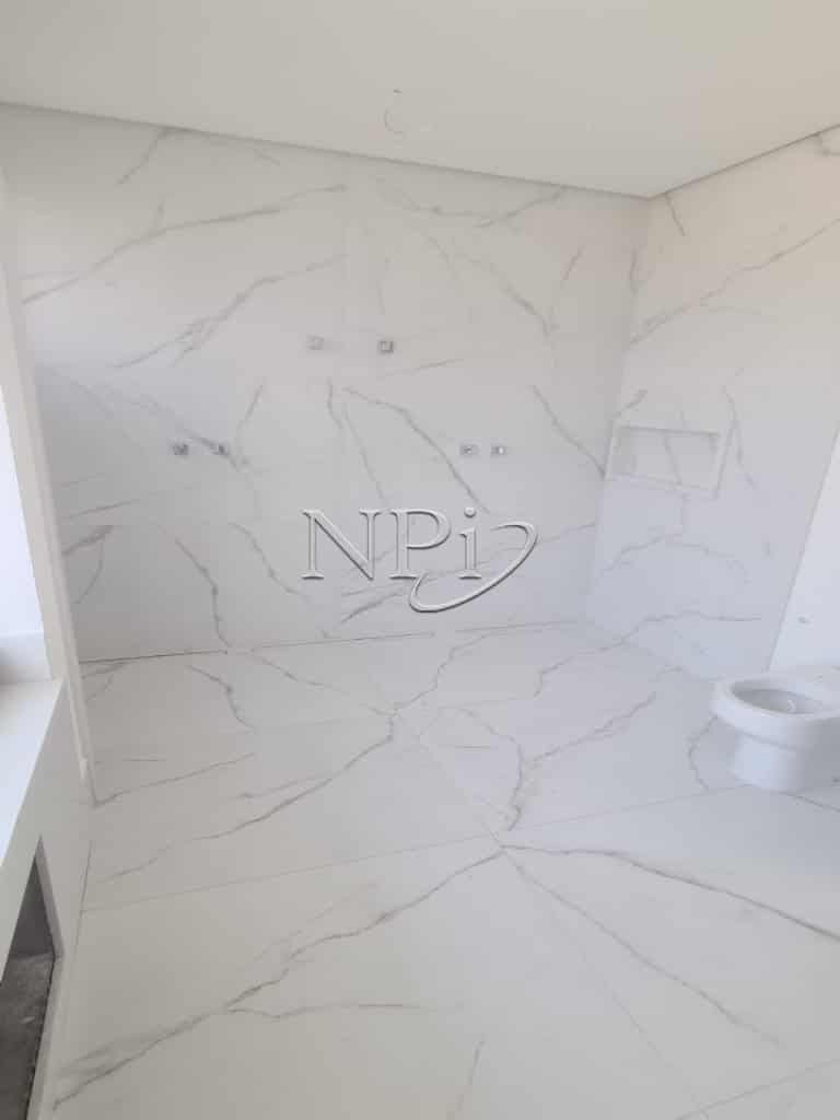 7 banheiros, incluindo o externo, com acabamentos refinados e pias modernas.