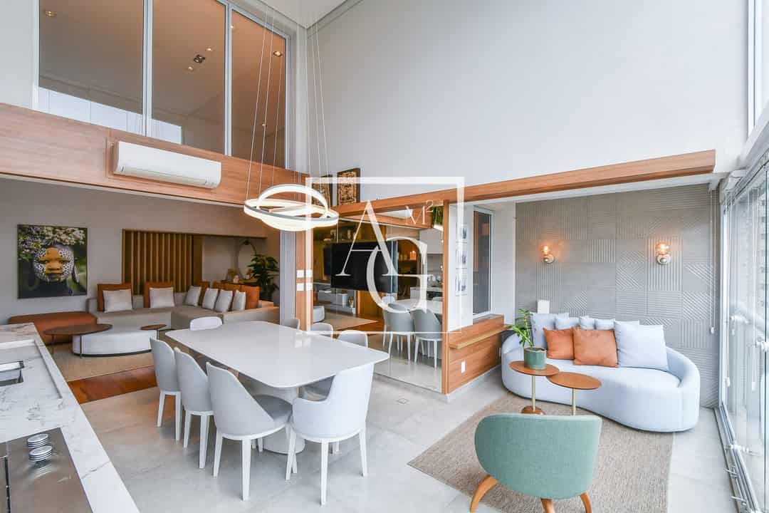 A sala de estar e a sala de jantar são amplas e bem iluminadas, com janelas grandes que permitem a entrada de luz natural e proporcionam vistas para a área externa. A cozinha é equipada com móveis planejados e eletrodomésticos de última geração, atendendo às necessidades mais exigentes. O ambiente é integrado de forma fluida, criando uma sensação de espaço e praticidade.