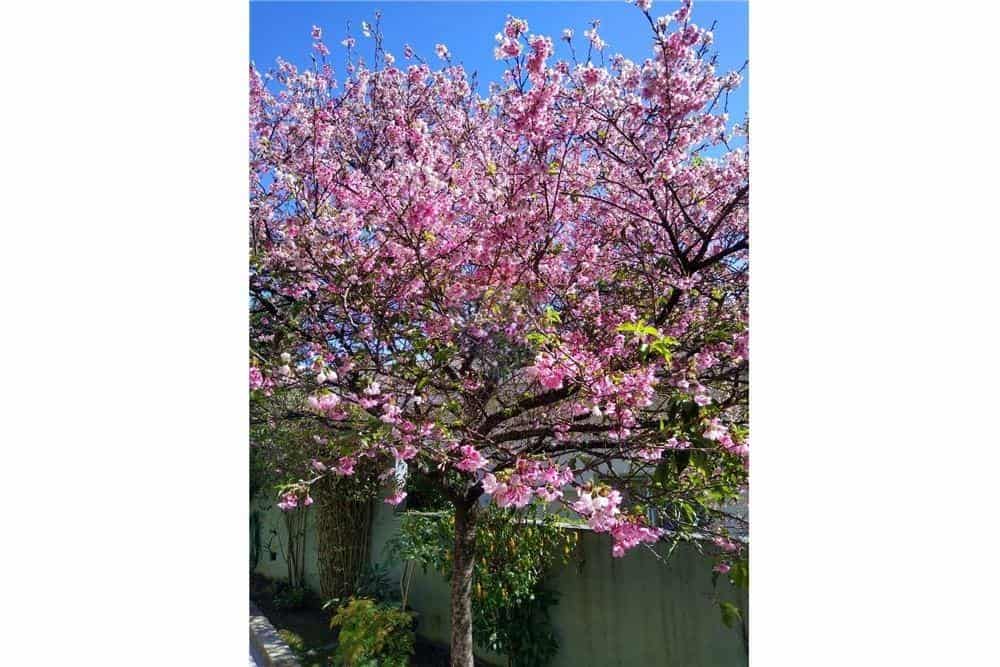 Ao redor, um amplo jardim rodeia a casa, com três cerejeiras e outras árvores frutíferas, criando um espaço verde exuberante que proporciona tranquilidade e um ambiente propício à meditação e lazer.