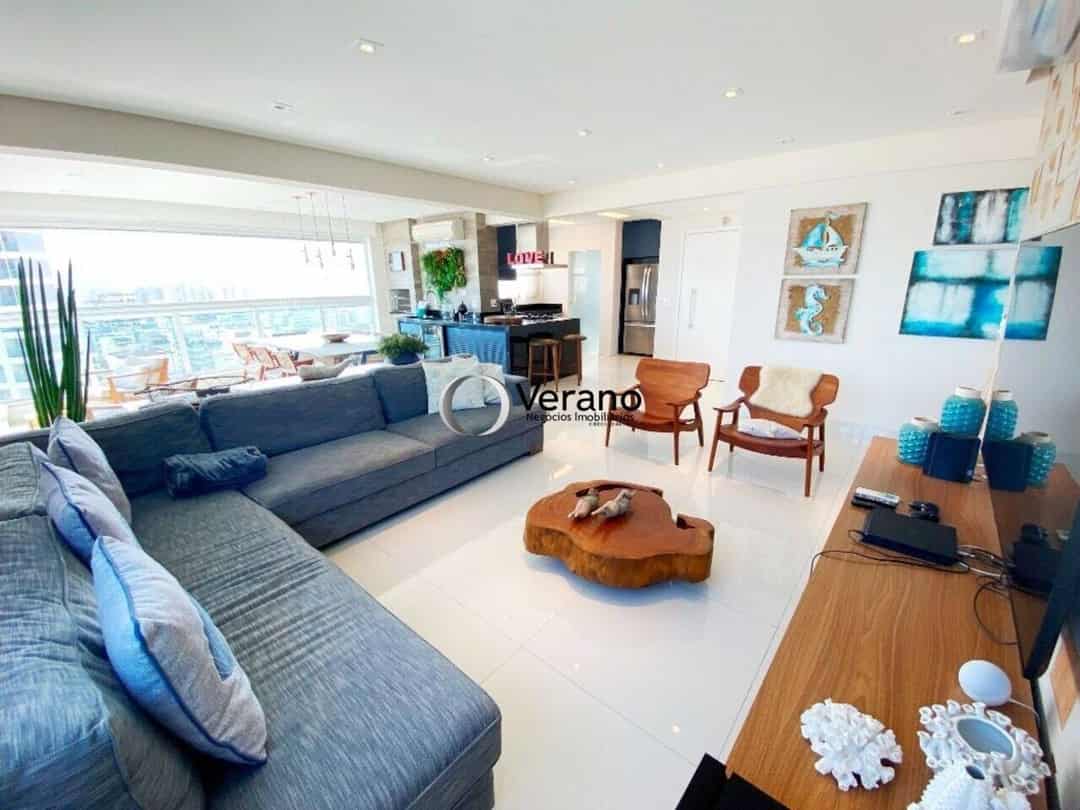 A sala ampla é climatizada com ar-condicionado, oferecendo um espaço agradável para momentos de descanso e convivência. Sua integração com varanda e cozinha cria um ambiente fluido e moderno