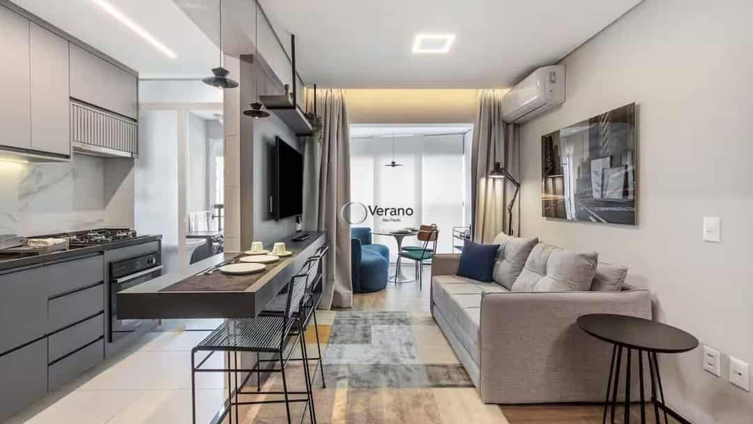 A cozinha, também integrada à sala, oferece um layout aberto que favorece a interação entre os espaços e cria uma sensação de amplitude. Este apartamento é a combinação perfeita de design moderno e soluções práticas para quem deseja viver de forma confortável e estilosa, aproveitando ao máximo cada metro quadrado.