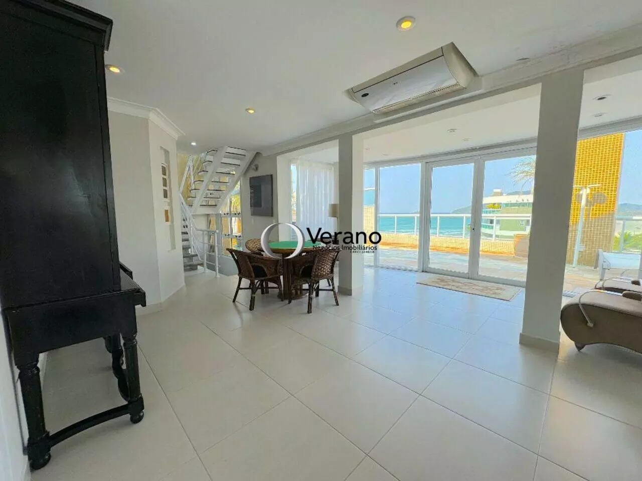 O ambiente interno é completamente climatizado, garantindo conforto térmico em todas as áreas. A sala de estar, ampla e iluminada, oferece acesso direto à varanda gourmet, criando uma transição perfeita entre o interior e o espaço externo. A varanda gourmet é ideal para momentos de lazer, com uma bela vista para o mar, além de contar com um ambiente aconchegante para refeições ao ar livre. A sala de jantar, interligada à sala de estar, também possui um design moderno e funcional, proporcionando fluidez nos ambientes.