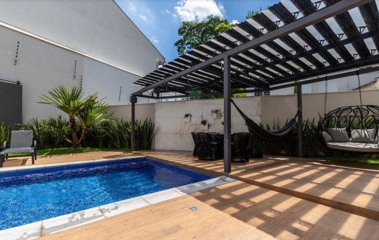 A área externa é um verdadeiro refúgio particular. A piscina se destaca como ponto central de lazer, cercada por um ambiente agradável que permite momentos de relaxamento e diversão em total privacidade. É o espaço ideal para aproveitar dias ensolarados ou reunir amigos e familiares em um cenário acolhedor e elegante.