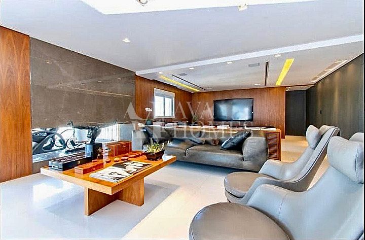 Apartamento com projeto aberto que permite a integração das áreas do living, jantar e gourmet. Possui piso em mármore italiano em placas casando os veios, marcenaria em toda extensão das paredes em todos os ambientes e lavabo com pia, bancada esculpida em ônix e TV espelhada. Conta com automação de controle total, incluindo hidromassagem, lareira, cortinas, janelas e liberação das portas. Cozinha assinada pelo Studio Ornare e totalmente equipada com a viking concept. Dispõe de móveis de designers, equipamentos Viking concept, fogão, forno, microondas, coifa, refrigerador, lava-louças, adega, frigobar e máquina de gelo. Conta com dependência de funcionários e área de serviço e despensa que são repletas de armários. Possui cortinas Blackout e silhouette, projetor de telão com elevador lift de teto e aquecimento à gás com boiler. Na área íntima conta com uma suíte de hóspede, escritório e suíte máster, que conta com integração a sala de banho e hidromassagem. Possui amplo closet e banheiro individualizado. Toda área íntima conta com portas blindadas. Prédio com cinco vagas, sendo uma box com fechamento automatizado e depósito privativo.